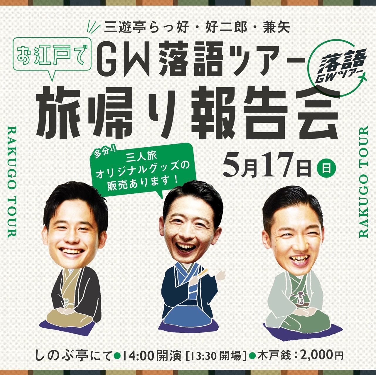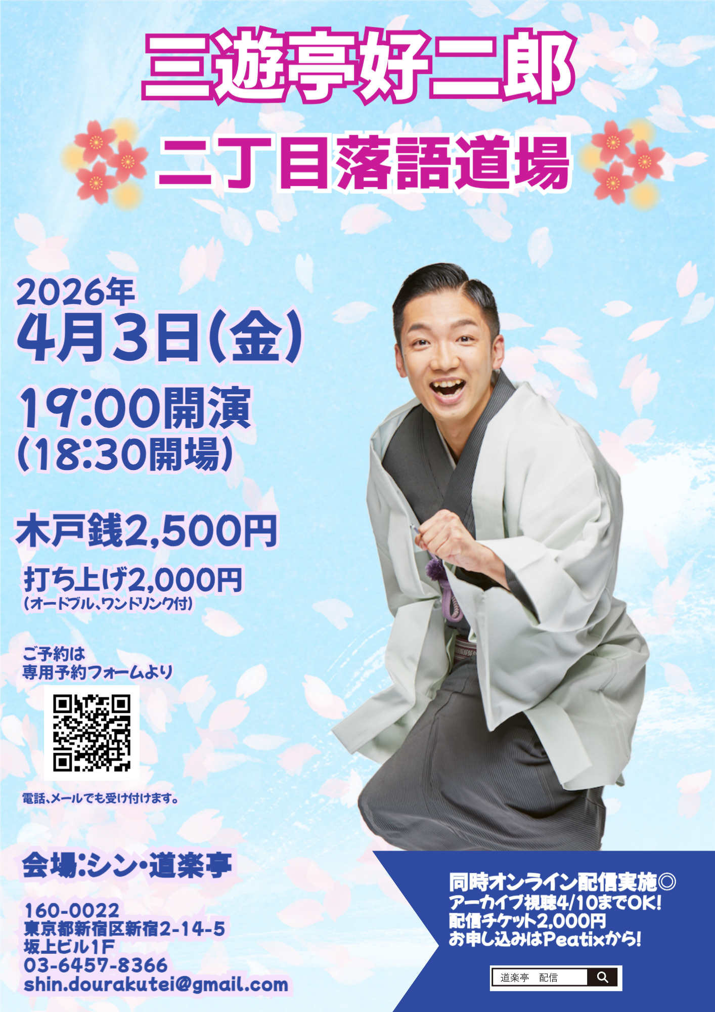 出演情報Schedule 02月 寄席・落語会出演 両国寄席 日時2026.02.2(月) 開演18時 会場お江戸両国亭 詳しく見る> 国分寺市民の集い 日時2026.02.6(金) 開演15時30分 会場 第25回さがみはら若手落語家選手権【第3回 予選会】 日時2026.02.8(日) 開演14時 会場杜のホールはしもと 詳しく見る> 両国寄席 日時2026.02.9(月) 開演18時 会場お江戸両国亭 詳しく見る> しゃばしゃばのらくご 日時2026.02.10(火) 開演19時30分 会場東新宿カフェコマド 詳しく見る> 圓蔵亭 日時2026.02.11(水) 開演14時 会場ひらい圓蔵亭 亀戸梅屋敷寄席 日時2026.02.12(木) 開演13時30分 会場亀戸梅屋敷 詳しく見る> 楽生師匠の会 日時2026.02.13(金) 開演 会場 きくはる落語会 ※満席 日時2026.02.14(土) 開演14時 会場居酒屋㐂久春 高円寺演芸祭り寄席 第二部 日時2026.02.15(日) 開演14時 会場氷川神社 詳しく見る> ナツノカモ作品集① 三笑亭夢丸「泣き虫お袖」(初演) 三遊亭好二郎「口出屋」(初演) 日時2026.02.16(月) 開演19時 会場ばばん場 詳しく見る> 三遊亭好二郎十周年記念 兼好・好二郎親子会 日時2026.02.20(金) 開演18時45分 会場浅草フランス座演芸場東洋館 詳しく見る> 水戸みやぎん寄席 三遊亭好二郎独演会 日時2026.02.27(金) 開演18時30分 会場水戸みやぎん寄席 詳しく見る> 水戸みやぎん寄席 好二郎・かけ橋二人会 日時2026.02.28(土) 開演13時/16時 会場水戸みやぎん寄席 詳しく見る> メディア出演 2026年02月の出演予定はまだありません。 レギュラー出演 2026年02月の出演予定はまだありません。 03月 寄席・落語会出演 亀戸梅屋敷寄席 日時2026.03.5(木) 開演13時30分 会場亀戸梅屋敷 詳しく見る> シャイニング★フォー 日時2026.03.5(木) 開演19時 会場ばばん場 詳しく見る> 両国寄席 日時2026.03.6(金) 開演18時 会場お江戸両国亭 詳しく見る> 両国寄席 日時2026.03.13(金) 開演18時 会場お江戸両国亭 詳しく見る> グリーンホール八起寄席 日時2026.03.16(月) 開演14時 会場相模原南市民ホール 浅草 好二郎独演会その十 ゲスト:しゃばぞう 日時2026.03.21(土) 開演14時 会場あさくさ劇亭 詳しく見る> ことより落語会 日時2026.03.22(日) 開演16時 会場ことより酒店 圓蔵亭 日時2026.03.27(金) 開演19時 会場ひらい圓蔵亭 好二郎・好志朗二人会 日時2026.03.29(日) 開演14時 会場江東区文化センター第一和室 メディア出演 2026年03月の出演予定はまだありません。 レギュラー出演 2026年03月の出演予定はまだありません。 04月 寄席・落語会出演 2026年04月の出演予定はまだありません。 メディア出演 2026年04月の出演予定はまだありません。 レギュラー出演 2026年04月の出演予定はまだありません。 05月 寄席・落語会出演 2026年05月の出演予定はまだありません。 メディア出演 2026年05月の出演予定はまだありません。 レギュラー出演 2026年05月の出演予定はまだありません。 06月 寄席・落語会出演 2026年06月の出演予定はまだありません。 メディア出演 2026年06月の出演予定はまだありません。 レギュラー出演 2026年06月の出演予定はまだありません。 07月 寄席・落語会出演 2026年07月の出演予定はまだありません。 メディア出演 2026年07月の出演予定はまだありません。 レギュラー出演 2026年07月の出演予定はまだありません。 08月 寄席・落語会出演 2026年08月の出演予定はまだありません。 メディア出演 2026年08月の出演予定はまだありません。 レギュラー出演 2026年08月の出演予定はまだありません。 09月 寄席・落語会出演 2026年09月の出演予定はまだありません。 メディア出演 2026年09月の出演予定はまだありません。 レギュラー出演 2026年09月の出演予定はまだありません。 10月 寄席・落語会出演 2026年10月の出演予定はまだありません。 メディア出演 2026年10月の出演予定はまだありません。 レギュラー出演 2026年10月の出演予定はまだありません。 11月 寄席・落語会出演 2026年11月の出演予定はまだありません。 メディア出演 2026年11月の出演予定はまだありません。 レギュラー出演 2026年11月の出演予定はまだありません。 12月 寄席・落語会出演 2026年12月の出演予定はまだありません。 メディア出演 2026年12月の出演予定はまだありません。 レギュラー出演 2026年12月の出演予定はまだありません。 01月 寄席・落語会出演 2027年01月の出演予定はまだありません。 メディア出演 2027年01月の出演予定はまだありません。 レギュラー出演 2027年01月の出演予定はまだありません。