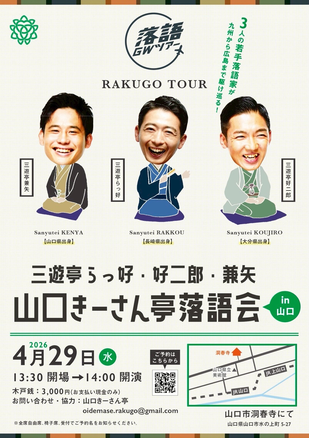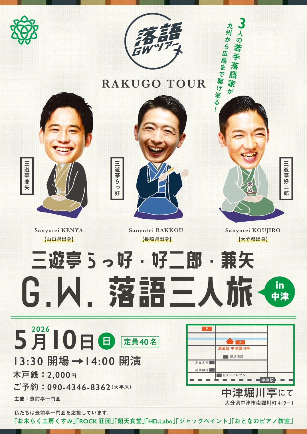 プロフィールProfile 三遊亭 好二郎さんゆうてい こうじろう 芸名 三遊亭好二郎(さんゆうてい こうじろう) 本名 河野洋平(かわの ようへい) 生年月日 平成2年(1990年) 3月7日 出身地 大分県玖珠郡九重町 階級 二ツ目 紋 三つ組橘 出囃子 鞘当て 好きな食べ物 蕎麦、お好み焼き、コーヒー、あんパン 経歴 福岡大学法学部卒業後、福岡で印刷会社の営業を経て 2016.02.04 三遊亭兼好に入門、前座名「じゃんけん」 2016.03.12 両国寄席にて初高座「八九升」 2020.02.01 二ツ目昇進
